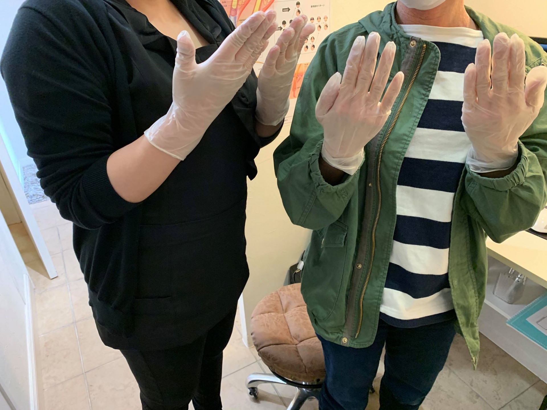 今から始まる発毛治療の前にお客様に手袋をはめて頂くと、