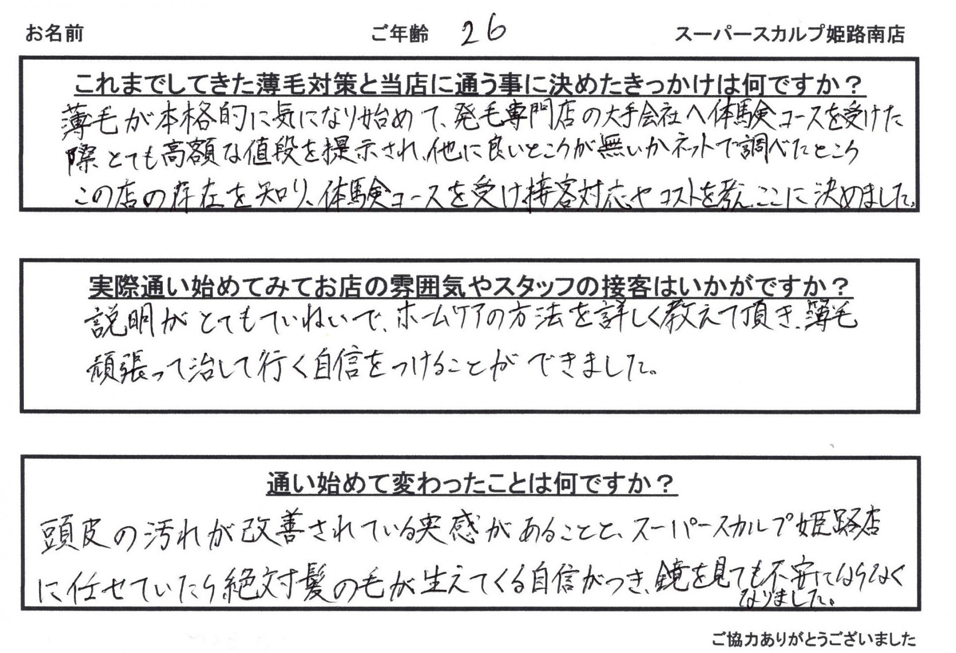 頭皮の汚れが改善されている実感があることと、スーパースカルプ姫路店に任せていたら絶対髪の毛が生えてくる自信がつき