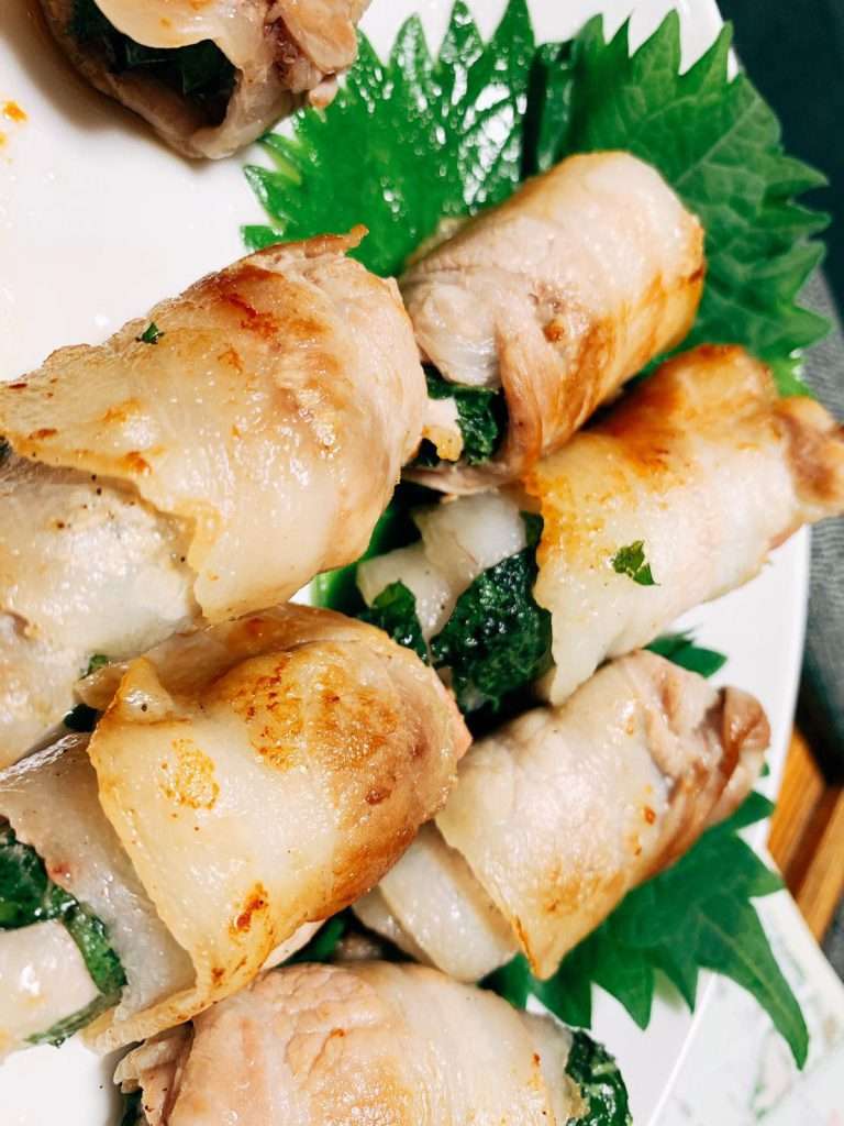 豚バラ肉に大葉をくるくると巻いて、フライパンに油を少しひいて後は
