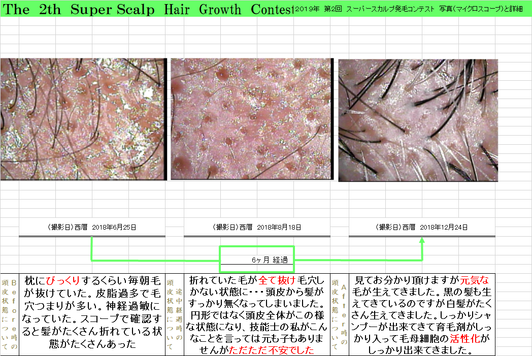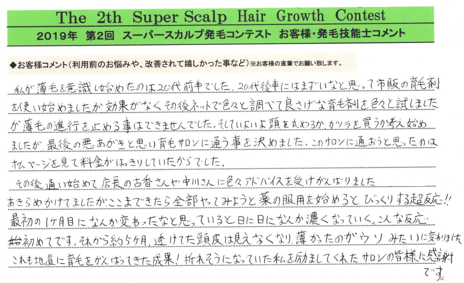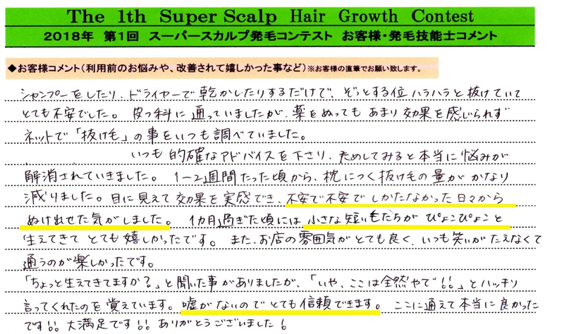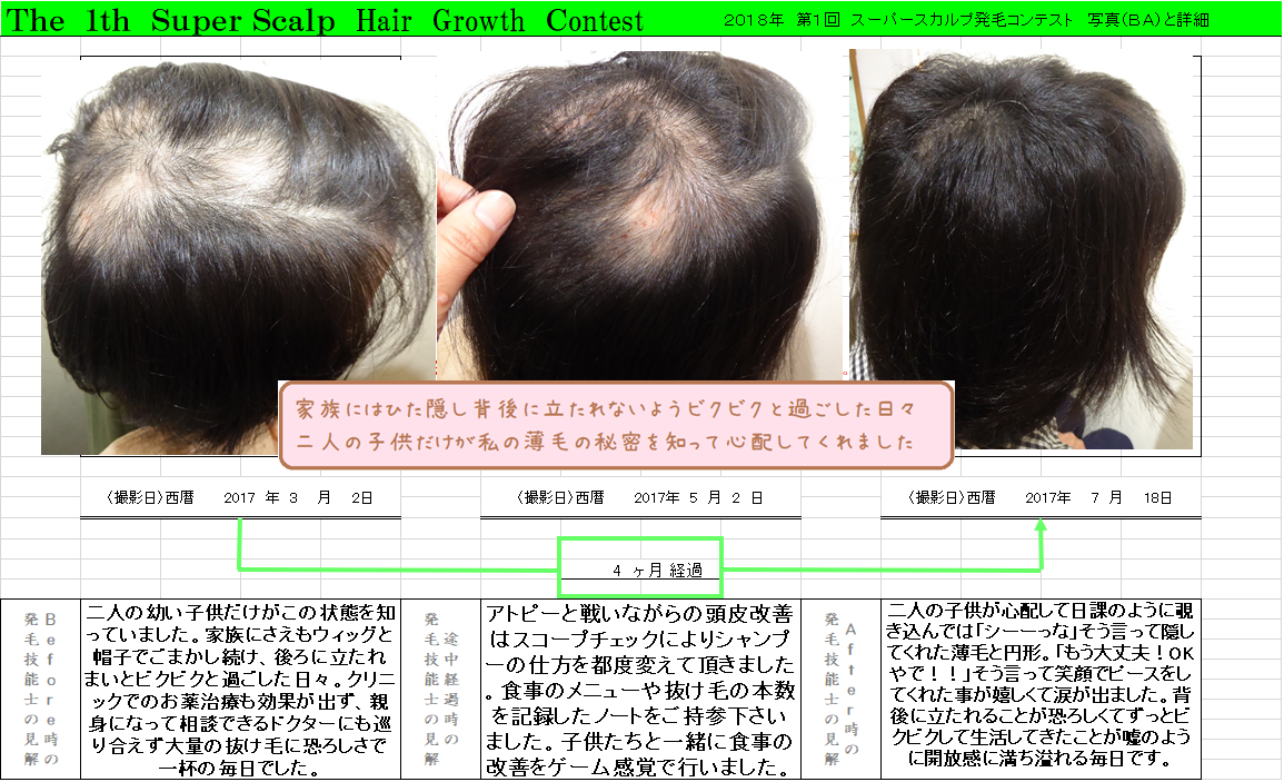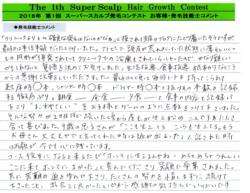 「クリニックよりもっと確実な発毛はないのかなぁ」と探されて当店のブログにたどり着いたそうですが最初は半信半疑だったと仰いました。アトピーで頭皮が荒れまくっていた状態に薄毛といくつもの円形が併発されていてクリニックでの治療もされていらっしゃったのでかなり難しいかもしれないと覚悟を決めてお受けしました。生活指導、食事指導、根本的なところからの意識改革をしていただきました。最初の頃は毎回ノートを持ってこられて起床時〇本、シャンプー時〇本、ドライヤー時〇本と抜け毛の本数を記録する徹底ぶり。朝食___昼食___夕食___と食事の内容も記録してくださり”まごわやさしい”をお子様とゲームのように点数をつけてくださいました。そんな努力が2か月ほど続いたころから産毛が生え始め二人で手をたたき合って喜びました。9歳の息子さんが「ここも生えてる、こっちも生えてる。もうお母さん大丈夫やでと言ってくれた時は涙が出よった」と話された時のお顔が今でも心に残っています。