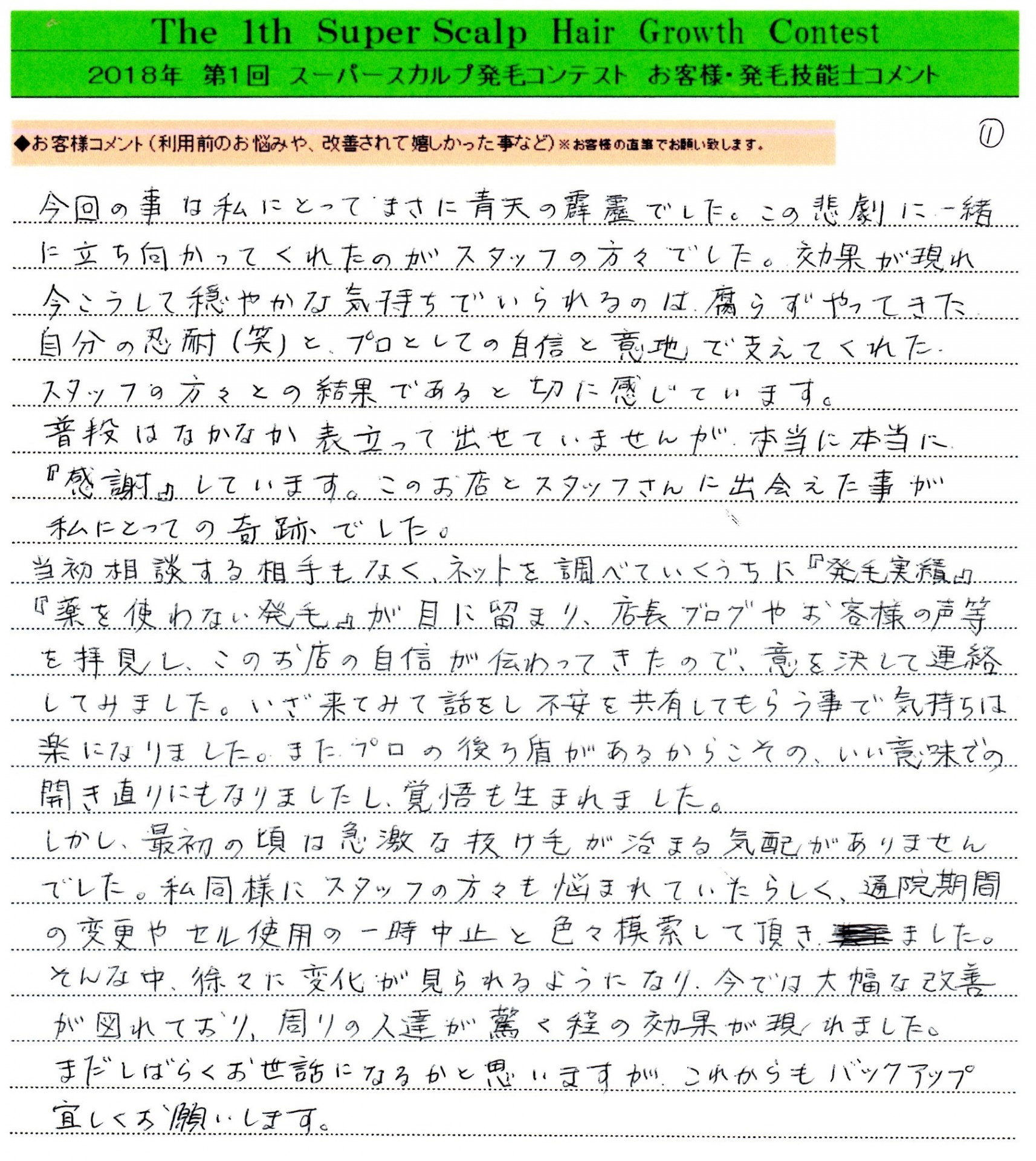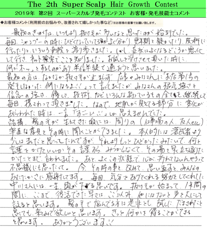 最初のきっかけは、いつもより抜け毛が多いなと思ったことが始まりでした。毎回、シャンプーの時にひどくなっているのがよく分かり、更年期と疑ったり、皮膚科に行ったりと、いろいろ病院を渡り歩きました。しかし、症状は良くなるどころか悪化していき、ネット検索でここを知りました。お試しを受けさせて頂いた時に、何か「ホッ」とするものがあり、半信半疑で通おうと思いました。最初の方はなかなか抜け毛が止まらず、店長や皆さんに「お店第1号の発毛しなかった例になるよ!」って言ってましたが、皆さんの根気強さと新年の強さ、優しさ、技術などいろんな持ってるもの全てを継続して毎回、携わって頂きました。なので、地肌が見えてる部分に変化が現れた時は、一言、「すごい!!」しか思えませんでした。結構、髪の毛が生えてきた頃には、周りの(仕事場の人、友人etc.)率直な意見をその時に聞くことができました。本人的には落武者よりすこしはましだと思ってたんですが、それよりももっとひどかったみたいで、何と言葉をかけていいか、その言葉すら見つからなくて、その場を早く立ち去りたかった、とまで言われました。あと、よくこの状態で心が折れてないんやろって不思議にも思ったって。今、その時の事を改めて思い返すと、みんなの温かさにも感謝してます。毎回、気分を上げてくれる努力をしてくれた×××には、一生、頭が下がる思いです。抜け毛が始まって、1年の間にここまで復活できた早さは、ここ以外、他にはないと声を大にして言えると思います。髪の毛で悩んでいる方は、是非とも試しに騙されたと思っても来てみて欲しいと思います。きっと何かを得ることができると思います。ありがとうございます!