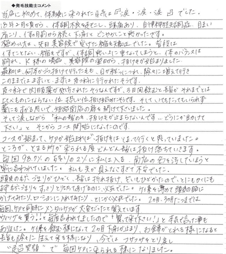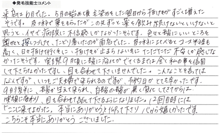 来店は6月でした。5月の初め頃、毛染めをした翌日から抜け毛がすごく増えたそうです。皮膚科で薬をもらったが、この先ずっと薬を飲み続けないといけないと思うと、イヤで病院に不信感しかなかったそうです。色々と髪にいいところを奥サマと探し続けて、たどり着いたのが姫路南店でした。皮膚科に比べるとコース料金も高く、日々、抜けていく毛に、抜け毛が止まらない毛に、ただただ不安しか感じなかったそうです。実際、9月頃に髪に変化が出てくるまでは、全く私の事を信用して下さらなかったですし、目も合わせて下さいませんでした。こんなことを言ってはなんですが、いつもご夫婦でこられるのですが、予約日がとても辛かったです。9月後半に、髪が生えて来られ、白髪の髪が黒く変化してきてからは、笑顔に変わり、目も合わせて話して下さるようになりました。12回目時には「ここに来てよかった。本当にありがとう。」と仰って下さり、心から嬉しかったです。こちらこそ本当にありがとうございました。