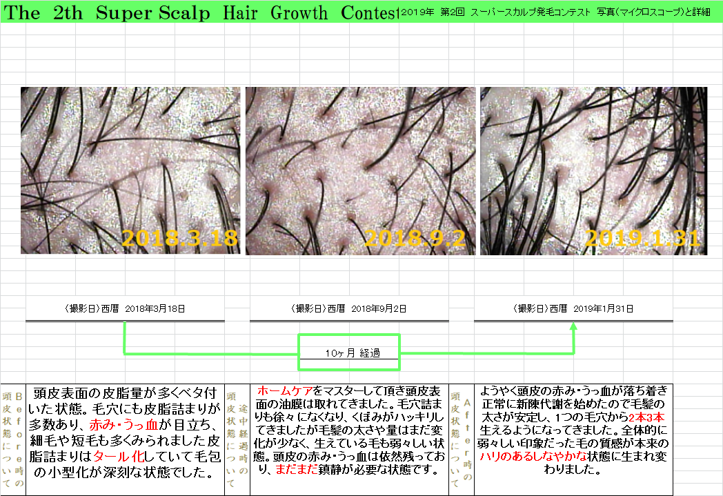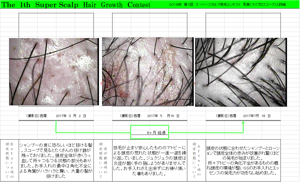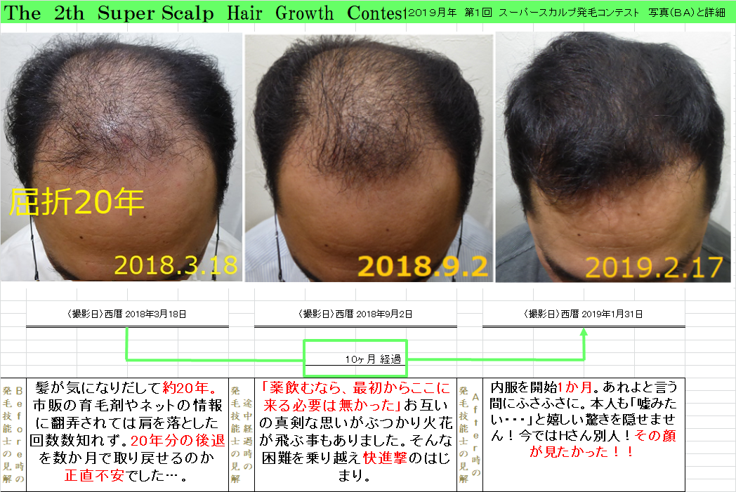 生えてくるかなぁー。とまず不安を感じました。スカルプの先生達はもちろんご存知ですが歴が長ければ長いほど発毛までの道のりは長くなります。Hさんは、カツラを考えられてましていよいよ頭を丸めるか、最後にカツラを作るかそれかイチかバチか発毛サロンへ行ってみるか!!悪あがきをしてみるか!と当店に来て下さいました。何といっても料金がハッキリしていたのが良かったと・・・通い始めてHさんの頭皮は頭皮ベタベタ全体にうっ血、赤み、皮脂詰まりと頭皮環境は最悪でした。まずは頭皮環境を整えてもらうことに専念して頂きましたが、半年間大きな変化は見られませんでした。生活習慣はとてもいいのでこれから先悩んでいました。7月頃Hさんに外用薬をお勧めしてみました。内服も外用も一切使用したくないとご希望のH様でしたので、少し考えたいと毎週2人でゆっくりと考えました。外用か内服を使うのであれば初めから『AGAクリニック行ったら良かったやん』とまで言われました。