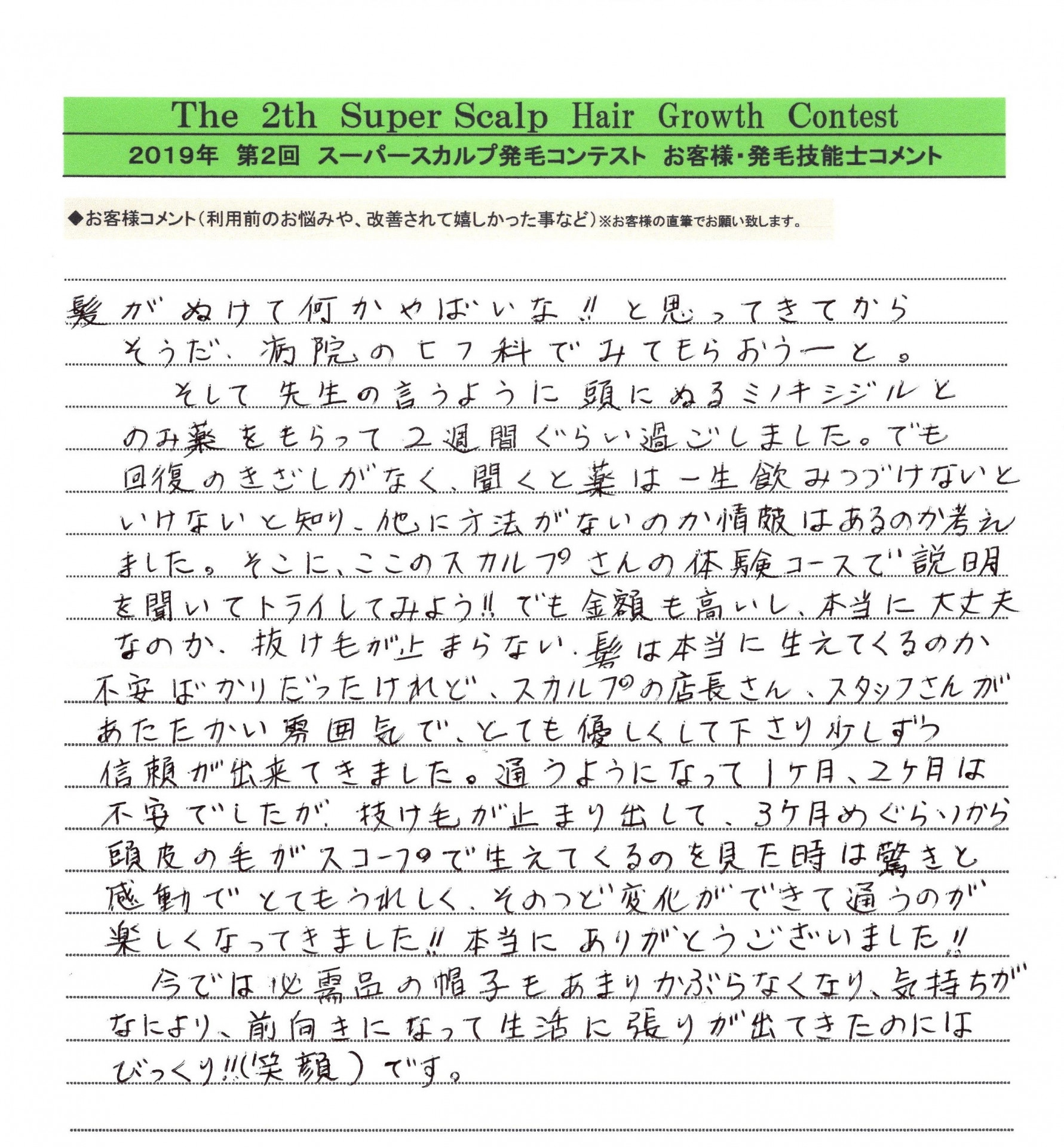 髪が抜けて何かやばいな!!と思ってきてから、そうだ、病院の先生にみてもらおうーと。そして、先生の言うように頭に塗るミノキシジルと飲み薬をもらって2週間くらい過ごしました。でも、回復の兆しがなく、聞くと薬は一生飲み続けないといけないと知り、他に方法がないのか、情報はあるのか考えました。そこに、ここのスカルプさんの体験コースで説明を聞いて、トライしてみよう!!でも、金額も高いし、本当に大丈夫なのか、抜け毛の止まらない髪が本当に生えてくるのか不安ばかりだったけれど、スカルプの店長さん、スタッフさんが暖かい雰囲気で、とても優しくして下さり、少しずつ信頼が出来てきました。通うようになって1ヶ月、2ヶ月は不安でしたが、抜け毛が止まり出して、3ヶ月目くらいから頭皮の毛がスコープで生えてくるのを見た時は、驚きと感動でとても嬉しく、その都度、変化ができて通うのが楽しくなってきました!!本当にありがとうございました!!今では、必需品の帽子もあまりかぶらなくなり、気持ちがなにより前向きになって生活に張りが出て来たのにはびっくり!!(笑顔)です。